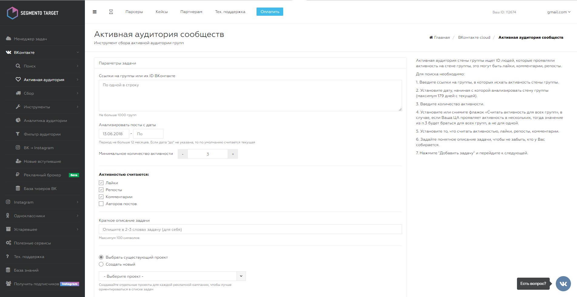 Сервис позволит вам рекламироваться только на людей, которые уже проявили интерес к тем же или смежным услугам в соцсетях, что и предлагаете вы. Точечный сбор такой аудитории возможен благодаря набору инструментов (парсеров) внутри сервиса по заданным вами параметрам.